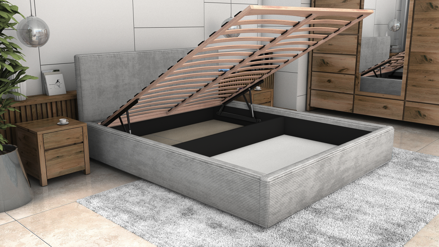 • Po zvednutí rámu postele je prostor rozdělen přepážkou. Zadní část přepážky nemá spodní desku, pouze přední má nádobu na lůžkoviny.