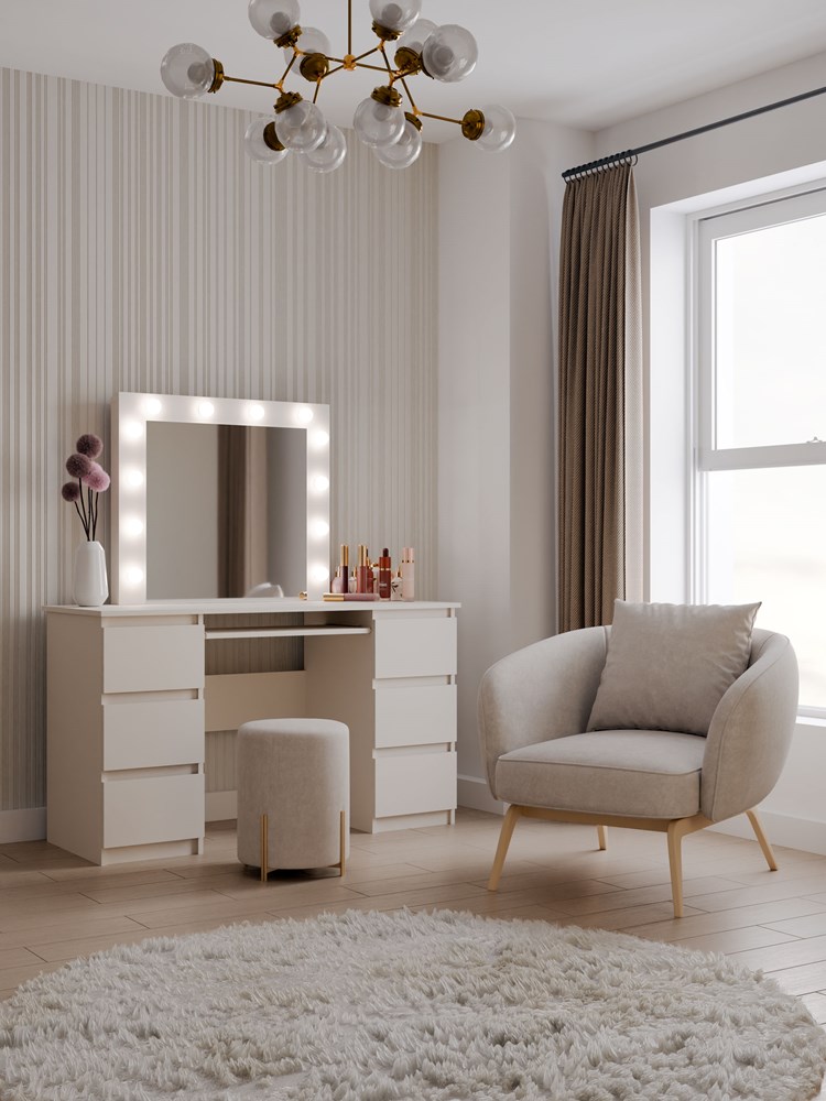 Toaletní stolek se zrcadlem a LED osvětlením je dokonalým nábytkem pro lidi, kteří oceňují pohodlí a krásu svého okolí. Promyšlený design umožňuje pohodlné uložení kosmetiky a šperků a může fungovat i jako praktický psací stůl.